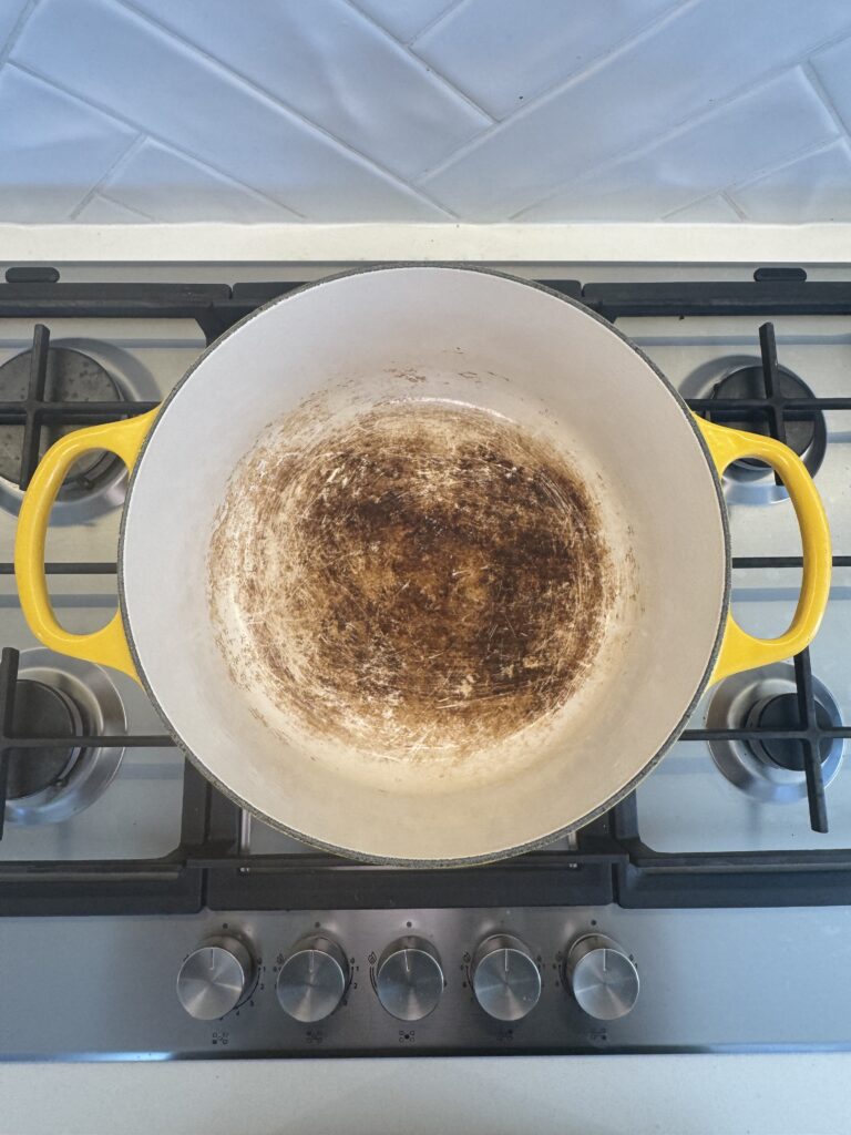 Sprinkle a generous amount of bicarb soda on the bottom of your burned pan and add a layer of water. Bring to a boil and then reduce to a simmer, you will see the water start to fizz as the bicarb soda gets to work. After a while you will be able to scrape off some burned bits with a silicone spatula. Leave the solution to work until you are confident that most of the burned bits have come loose. Wash the pot as you normally would.