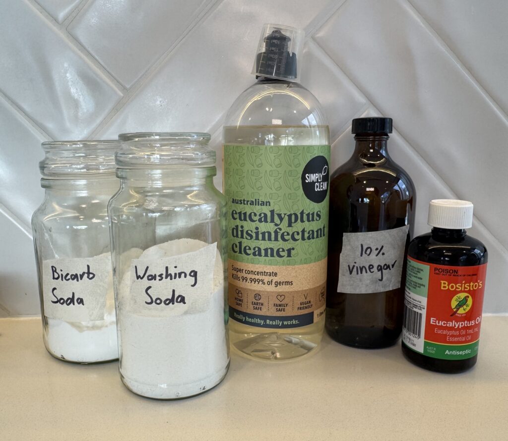 My cleaning products now include bicarb soda, washing soda, and 10% white vinegar from The Source bulk food stores. The first two I keep in old glass containers that once contained instant coffee. I bought a glass bottle for the vinegar at The Source. All these glass containers will last infinitely (provided they never take a tumble). I keep cleaning and cooking bicarb soda in separate containers.